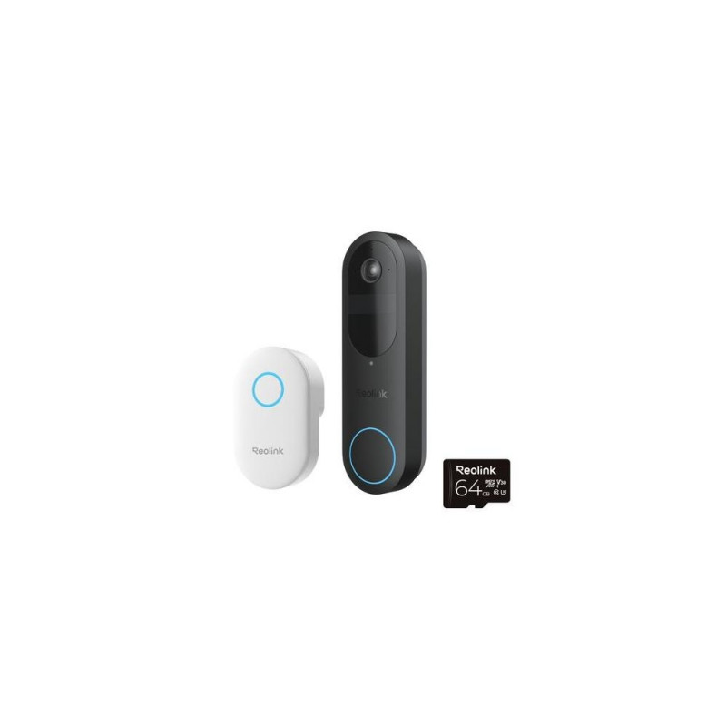 Reolink D340B with Chime and 64GB SD Card offers a high-resolution 4MP camera with a sweeping 150°x150°x180° head-to-toe view for comprehensive visibility. With smart detection for people, vehicles, and packages, you’ll always stay informed of what’s happening around your home. Engage instantly with visitors using the two-way audio feature, while the paired Chime ensures you receive alerts throughout your home, so you never miss an important notification. The included 64GB SD card provides ample local storage, allowing you to securely save and review footage whenever needed.<br><br><b>1:1 Aspect Ratio + 4MP HD</b><br><br>Experience 2K HD with a unique 1:1 aspect ratio, delivering a 150°x150°x180° head-to-toe view for exceptional front door visibility.<br><br><b>Smart Detection + Instant Alerts</b><br><br>When people, vehicles, or packages are detected, you will be notified by the real-time notification. Fear no more porch pirates, your packages are always under monitoring.<br><br><b>Rechargeable Battery + Hardwire</b><br><br>Flexible power options. Use the rechargeable battery or hardwire to existing wiring. The hardwire option supports mechanical chimes. (Power source: 8~24V, 5VA-40VA).<br><br><b>Dual-Band Wi-Fi Network</b><br><br>Supports both 5GHz and 2.4GHz Wi-Fi., meeting your diverse connectivity needs. 2.4GHz band offers extensive coverage, while 5GHz frequency delivers rapid network speeds.<br><br><b>Visitor Notification</b><br><br>Receive instant push notifications and even a video call when a visitor presses the doorbell. See their faces on the screen without having to open the door.<br><br><b>Multiple Chime Options</b><br><br>Whether you opt for Reolink Chime, a traditional mechanical chime, Google Assistant, or Reolink Home Hub, rest assured that our doorbell will complement your home environment.<br><br><b>Two-Way Audio + Quick Reply</b><br><br>Engage in real-time communication with visitors via two-way audio. Pre-recorded quick replies add convenience, letting them speak for you whenever needed.<br><br><b>Reliable Guardian in Any Weather</b><br><br>Designed to withstand the elements, this weatherproof doorbell provide reliable outdoor protection against dust and water.<br><br><b>HDR Tech</b><br><br>HDR technology dynamically adjusts the exposure to enhance image quality, ensuring clear and detailed visuals even in challenging lighting conditions.<br><br><b>Chime and 64GB SD card included</b><br><br>The Chime provides instant audible alerts throughout your home, ensuring you never miss a visitor or motion notification. The 64GB SD Card offers generous local storage, allowing you to store video footage directly on the device without needing a cloud subscription.Reolink D340B with Chime+64GB SD Card. Megapixel (approx.): 4 MP, Maximum video resolution: 2048 x 2048 pixels, Sensor type: CMOS. LED type: IR. Audio system: 2-Way. Product colour: Black. Compatible memory cards: MicroSD (TransFlash), Maximum memory card size: 256 GB, Memory card included: MicroSD