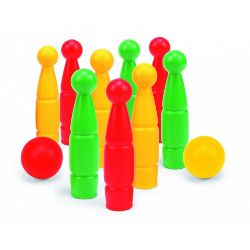 Zestaw do gry w kręgle (9 kręgli + 2 bile) w kolorowym kartoniku o długości 30 cm z rączką.