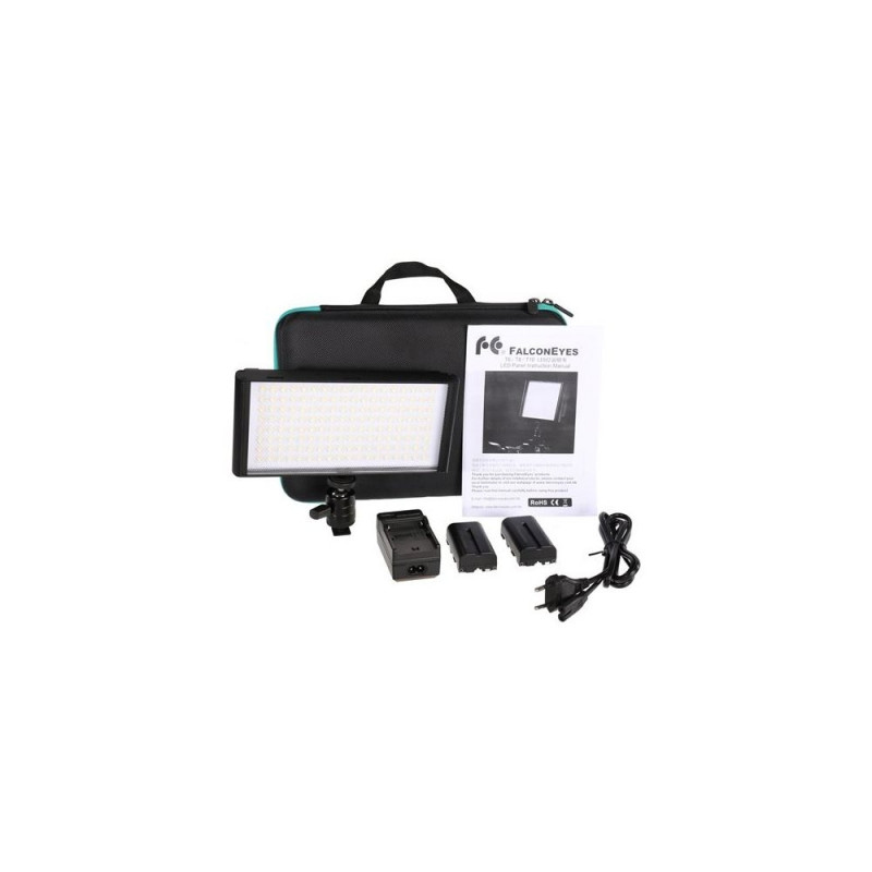 1x Falcon Eyes LED light T6;2x Battery Li-Ion NP-F550;1x Battery charger;1x Power cable for battery charger (2 pins);1x Mini ball head with male thread;1x Hotshoe adapter;1x Carrying case with foam;1x Manual;1x Packaging