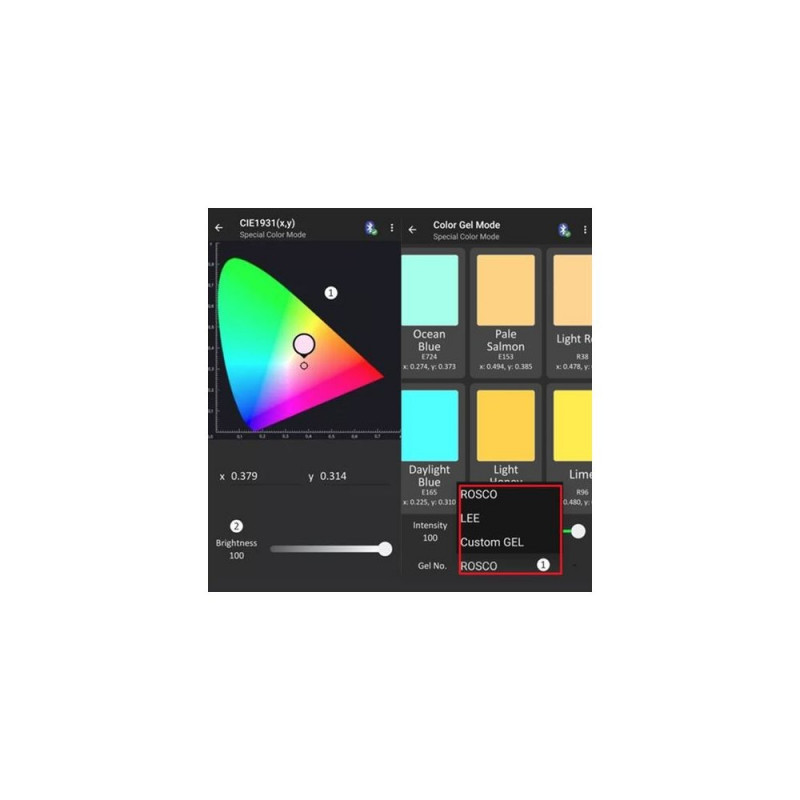 The DS-811 offers five different modes, accessible through an intuitive menu or your smartphone. Easily adjust brightness and color temperature in CCT mode between 2800K and 10000K. Use the RGB mode to create any color you can imagine, or the HSI mode to precisely control hue, saturation, and intensity. For extra creative freedom, there’s the Filter mode with 20 Rosco and 20 Lee filters, plus the Theme mode, perfect for special effects like flashing lights, candlelight, and thunder with customizable speed.