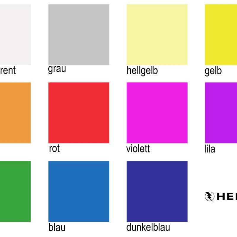 Farben: grün, dunkelblau, blau, violett, lila, hellgelb, gelb, orange, rot, grau, transparent.