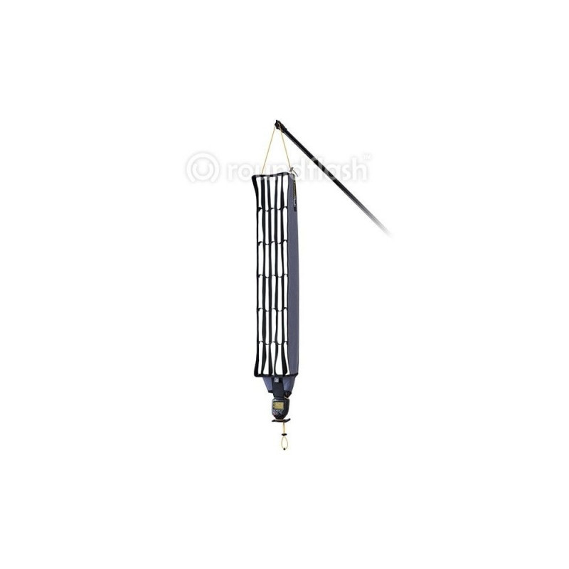Extremely light light box weighing only 170 grams. When folded, it takes up very little space. It has a removable honeycomb, an internal mirror lining that spreads the light evenly. The light box is 90x16 cm in size, two units can be combined to make a 200 cm long "stripbox" type light box.