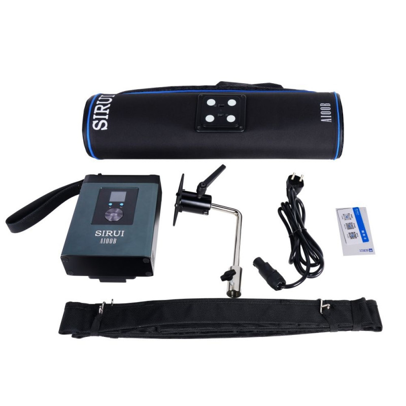 1x A100B LED panel; 1x Grid; 1x Controller; 1x Tripod clamp for controller; 1x Tripod adapter; 1x Power cable (EU); 1x Warranty card; 1x Service card; 1x Bag
