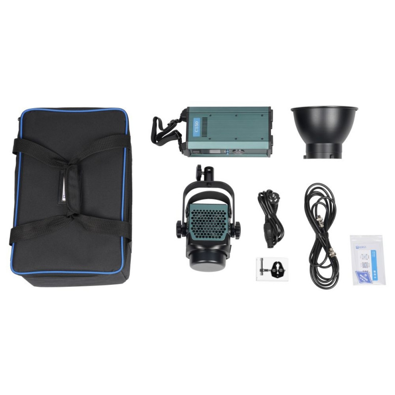 1x C150 LED lamp; 1x Controller; 1x Reflector; 1x Power Cable; 1x Connection cable; 1x Protection cap; 1x Light stand clamp for controller; 1x Carrying Case; 1x Warranty Card; 1x Service card