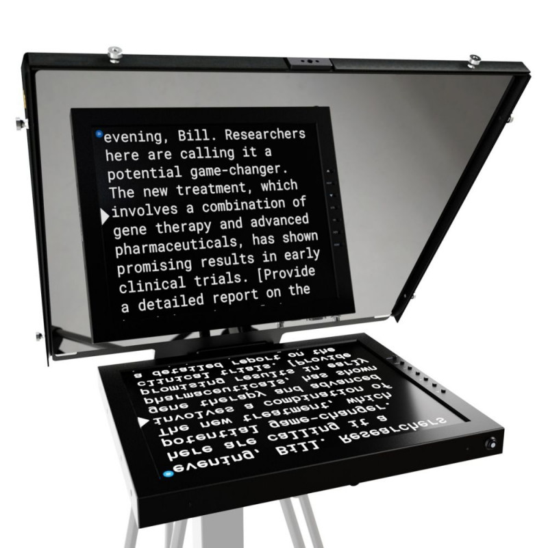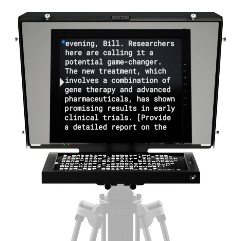 With a brightness of 1000 cd/m², the text remains easy to read even under direct lighting. The image reflection can be adjusted horizontally and vertically, allowing you to position the teleprompter flexibly. The included software "Prompter Pro 4" helps you control the text and simplifies operation during recording.