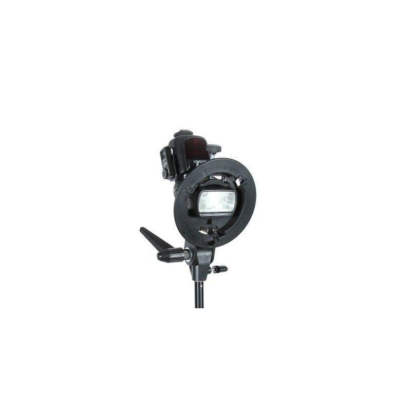 The Godox S type Bracket Bowens allows for the attachment of various flash units to a light stand, enabling the use of Bowens studio accessories. The included softbox measures 60x60 cm and provides a diffused lighting option for photography.