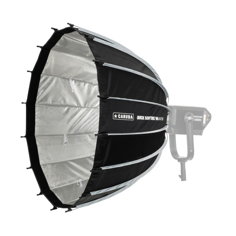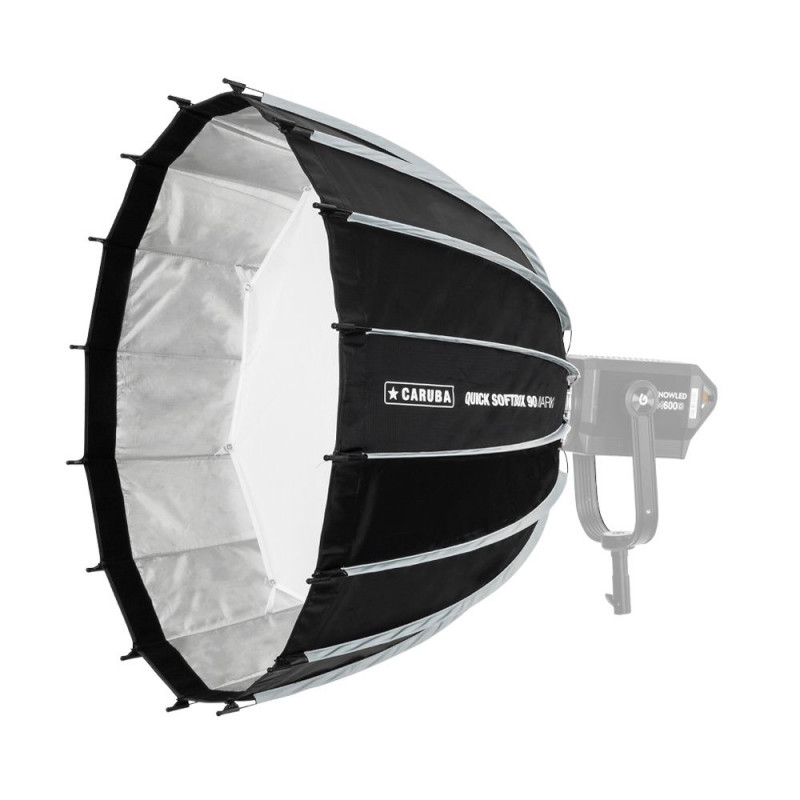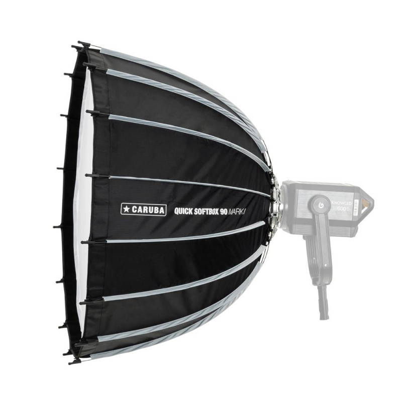 The Caruba Quick Softbox Mark II 90cm is a versatile softbox designed for creating soft, even lighting. It features a quick setup design, a detachable Bowens mount speed ring, and includes both internal and external diffusers.