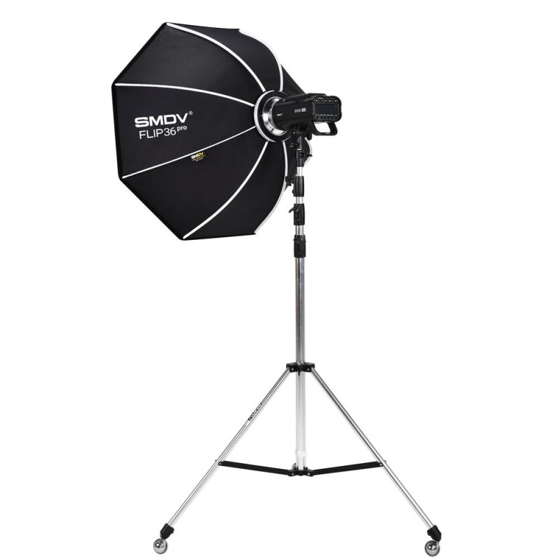The SMDV Speedbox Flip36 PRO is a lightweight octagonal softbox with a diameter of 90 cm, designed for quick setup and portability. It features removable middle and front panels made of embossed fabric, providing even light for photography and videography.