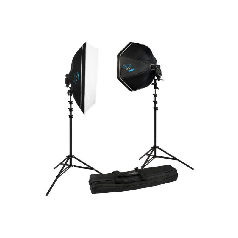 The Rapid Box Portable Portrait Speedlite Kit includes two light diffusers, a strip softbox and a 26" octabox, designed for on-location portrait photography. It features metal swivels with coldshoe mounts and adjustable light stands, allowing for easy setup and positioning of external flashes.