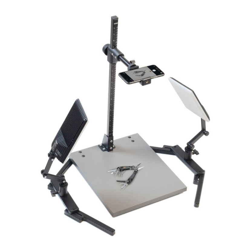 This set helps you capture two dimensional templates and small, flat objects precisely from above, while your smartphone or a light camera stays steady and the lighting remains even.