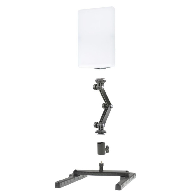 This compact daylight lamp helps you achieve even results and provides homogeneous lighting for photo and video tasks. The slim panel with diffuser plate produces soft light, which supports tabletop, still life or product recordings. Three locking joints allow flexible positioning of the light panel and let you adjust height and tilt precisely to your setup. Several mounting options are available, so you can attach the lamp to accessory shoes, stands or the variable base. The mains powered design supports long sessions without interruptions.