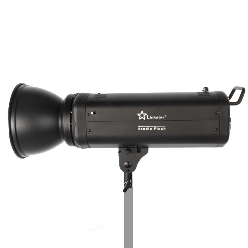 Linkstar LF-500D studio flash has 500Ws power, quick recharge, durable metal build, S-type bayonet for add-ons, motor cooling, and digital controls. Features a 250W adjustable modelling lamp and autodump. Includes sync cable and reflector.