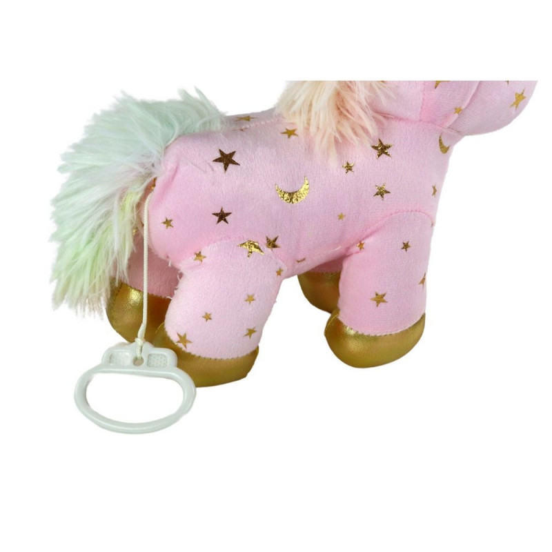 Jednorożec wyposażony jest w mechanizm grający kołysankę ? wystarczy pociągnąć za sznureczek z naciągiem, aby uruchomić delikatną melodię, która pomaga dziecku wyciszyć się i spokojnie zasnąć.