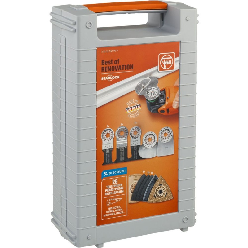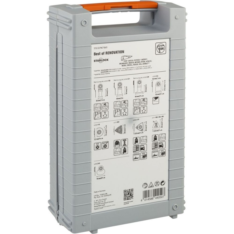 - Contents: 6 E-Cut Long-Life saw blades (2 each 50 x 35 mm, 50 x 50 mm, 50 x 65 mm), 1 carbide rasp (80 mm), 1 carbide segment saw blade (Ø 75 mm, 2.2 mm), 1 fixed spatula, 1 cutting blade (mushroom shape), 1 sanding plate, unperforated (80 mm), 5 sanding sheets each (K 60, 80, 120)