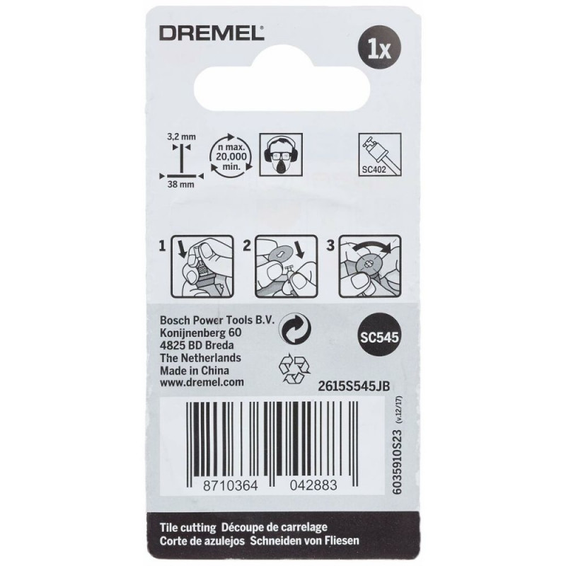 The Dremel S545 diamond disc is a cutting disc specially designed for tasks requiring precision and durability on hard materials. With a 38 mm working diameter, this silver round accessory easily fits Dremel tools with the EZ Speedclic system, allowing quick and secure changes without extra tools. This disc is made to efficiently cut materials such as concrete, stone, porcelain, ceramic, and hard epoxy resins, highlighting its versatility and toughness for professional and DIY applications. Its design optimizes performance on tough surfaces, ensuring clean, precise cuts without damaging surrounding material. It is also compatible with cordless battery-powered tools, providing convenience and mobility during use. The combination of a robust body and an edge impregnated with industrial diamonds offers high durability and faster cutting than conventional discs. This accessory is ideal for ceramic and porcelain work where delicacy and precision are essential, maintaining a neat, professional finish. In short, the Dremel Diamond EZ Speedclic S545 cutting disc is an indispensable tool for those needing reliable, specialized performance when cutting hard, resistant materials.