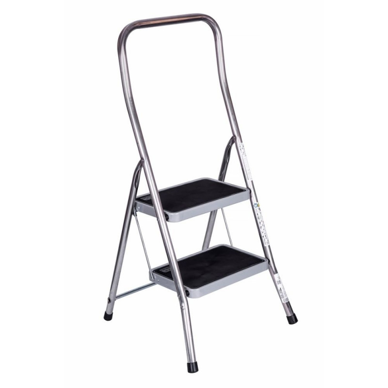 The Krause Folding Step Toppy XL silver is a sturdy aluminium folding step stool with 2 steps and a non-slip surface, designed for reliable support in various work environments.