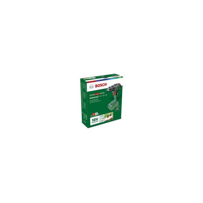 <br />Bosch Universal Drill 18V-60. Product design: Pistol grip drill, Chuck type: Keyless, Motor type: Brushless. Chuck capacity (max): 1.3 cm, Idle speed (max): 1900 RPM, Drilling diameter in wood (max): 3.5 cm. Power source: Battery, BatteryWarning: Last items in stock!