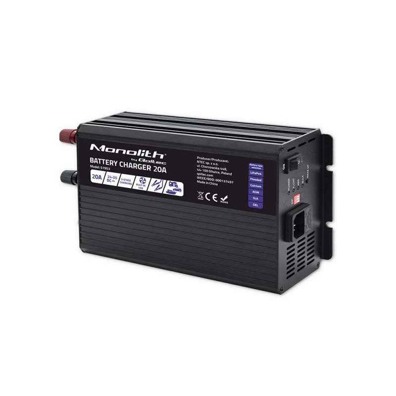 Qoltec Smart Monolith Battery Charger for LiFePO4 AGM GEL SLA batteries | 20A | 24V