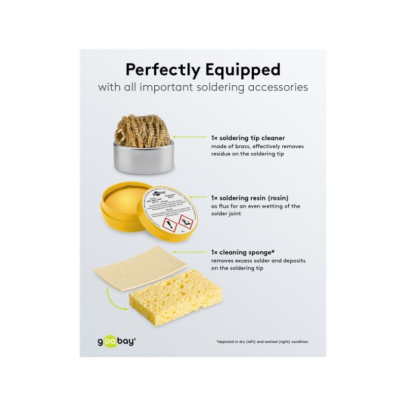 | Scope of delivery | Cleaning wool, Flux (soldering resin), Soldering sponge |