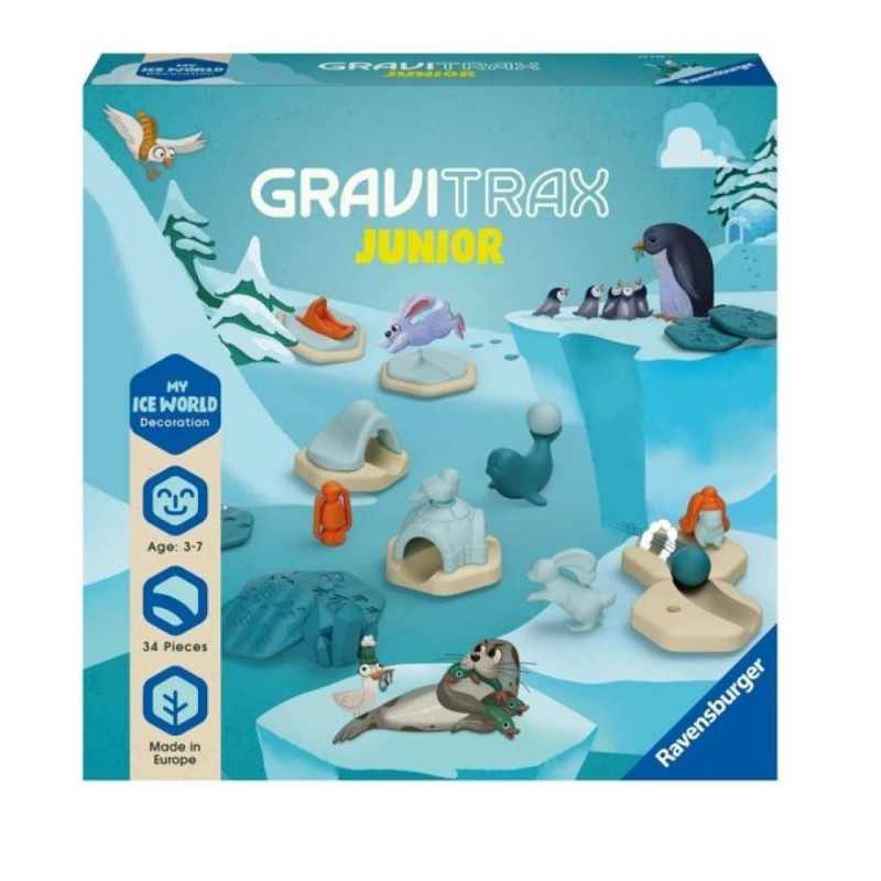 The Ice Adventure Expansion Pack is an extension to any GraviTrax Junior starter pack. You have over thirty different elements at your disposal. Build a track that leads through frosty, Arctic regions! The plastic ball runs under the igloo and the ice cave, encountering funny animals along the way!