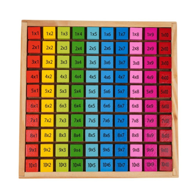 Wooden board for learning multiplication for children over 3 years of age. The board has 100 compartments, and each of them holds a block. On the upper part of the block there are factors for multiplication, and on the lower part the product. The blocks are made in vivid colors, attracting the child's eye and encouraging educational play.