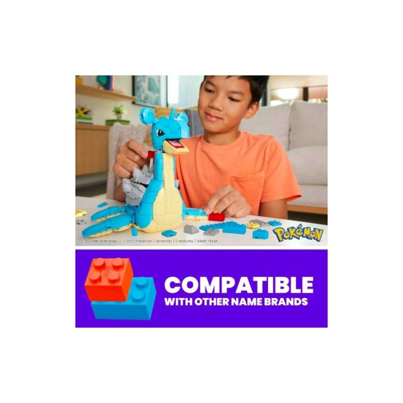 Lapras, imponujący Pokémon transportowy, jest teraz dostępny jako zestaw do budowania z ruchem. Zbudowany model ma 7 cali wysokości, aby pokazać ogromną skalę Laprasa. Obracaj korbą na muszli, aby poruszać głową w lewo i w prawo i obserwuj, jak Lapras pływa. Lapras to świetny dodatek do Twojej kolekcji Pokémonów i dobrze łączy się z innymi zestawami konstrukcyjnymi MEGA; każdy sprzedawany oddzielnie.