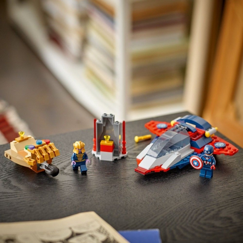 Zestaw zawiera dwie minifigurki: Thanosa w statku kosmicznym w kształcie Rękawicy Nieskończoności z ruchomymi palcami i wyrzutnią rakiet oraz Kapitana Amerykę w superszybkim Quinjecie z dwiema wyrzutniami klocków, otwieranym kokpitem i ukrytym schowkiem na tarczę. Osobny model zawiera kosmiczny kamień, który inspiruje do pomysłowej zabawy, gdy Kapitan Ameryka próbuje powstrzymać Thanosa przed kradzieżą cennego klejnotu. Każda torebka zawiera klocki i duży klocek startowy, co pozwala na szybkie zbudowanie modelu i postaci oraz szybkie rozpoczęcie zabawy. Intuicyjne instrukcje są umieszczone w kolorowej broszurze. Zestaw zawiera 107 elementów.