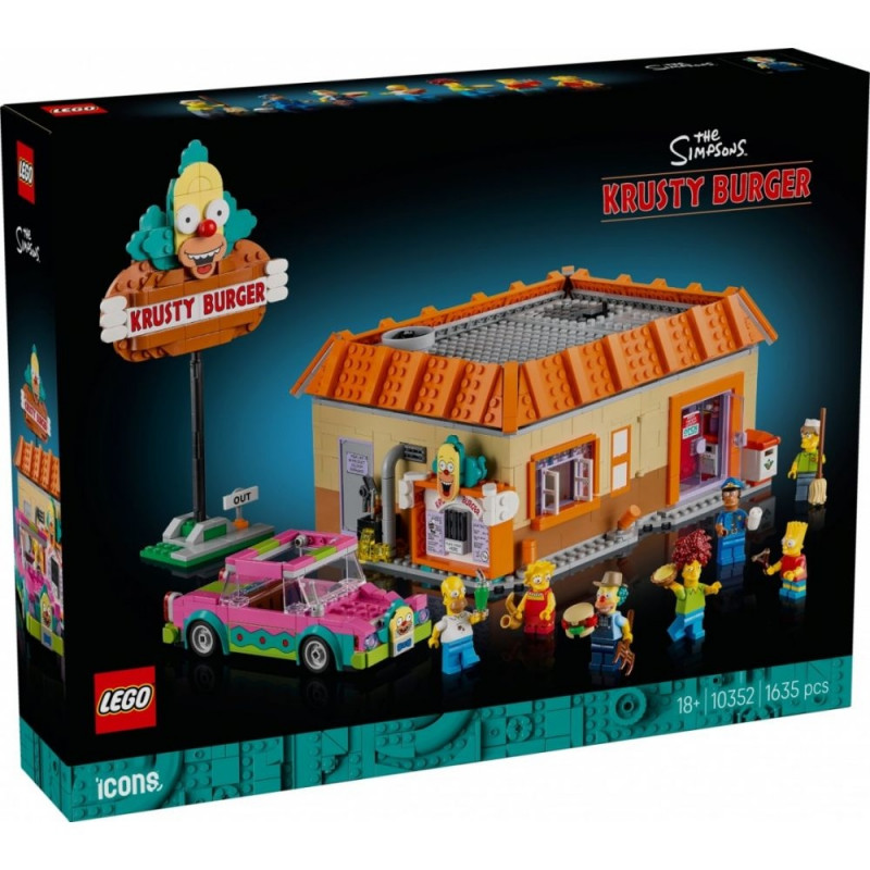 Zbuduj legendarny fast-food w Springfield dzięki zestawowi dla dorosłych LEGO Icons The Simpsons: Krusty Burger (10352). Stwórz szczegółowy model ulubionej restauracji Homera z kuchnią, jadalnią, toaletą i okienkiem drive-thru. Ta pozycja obowiązkowa dla każdego fana Simpsonów zawiera również znak z logo Krusty Burger, replikę klaunowego samochodu Homera, a także minifigurki Homera, Barta i Lisy Simpsonów, farmera Krustyego, Pomocnika Boba, Piszczyka i oficera Lou.