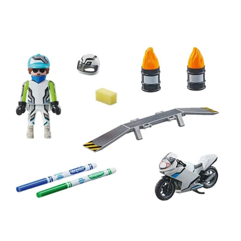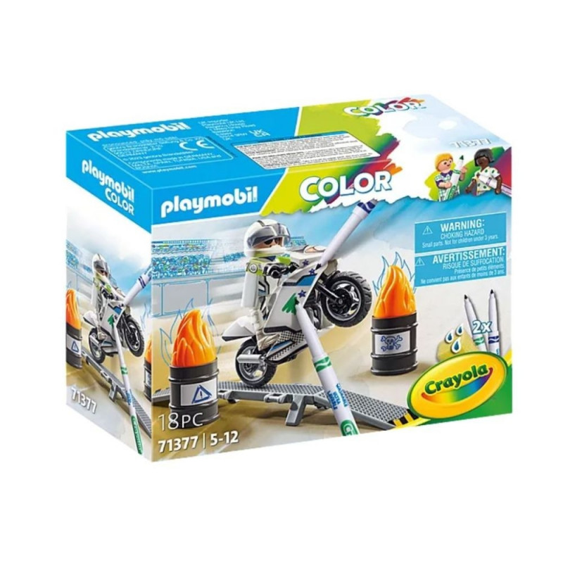 Zabawa kolorami z PLAYMOBIL Color! Zaprojektuj motocykl kaskaderski za pomocÄ doĹÄczonych pisakĂłw. BiaĹa figurka umoĹźliwia wykonanie wszystkich kreatywnych pomysĹĂłw. Kolory sÄ Ĺatwo zmywalne wodÄ, dla niekoĹczÄcej siÄ zabawy.