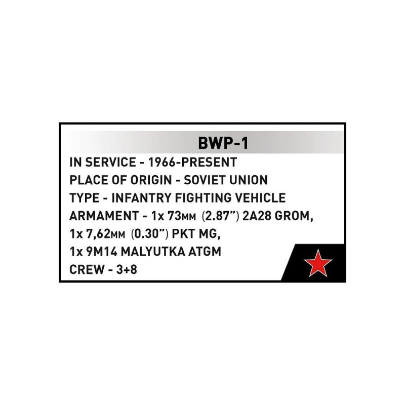 Model BMP-1 stał się wzorem szeroko eksportowanym i przez dekady stanowił trzon formacji zmechanizowanych w wielu armiach świata, również w Polsce. Pierwsze egzemplarze trafiły nad Wisłę w latach 19731974. Przez długi czas był podstawą sił polskiej piechoty zmechanizowanej, jednak w ostatnich latach coraz wyraźniej widać, że jego lata świetności już minęły. Polska przekazała wiele swoich BWP-1 walczącej Ukrainie. W naszym zestawie dajemy więc budowniczemu wybór polskich oraz ukraińskich oznaczeń pojazdu!