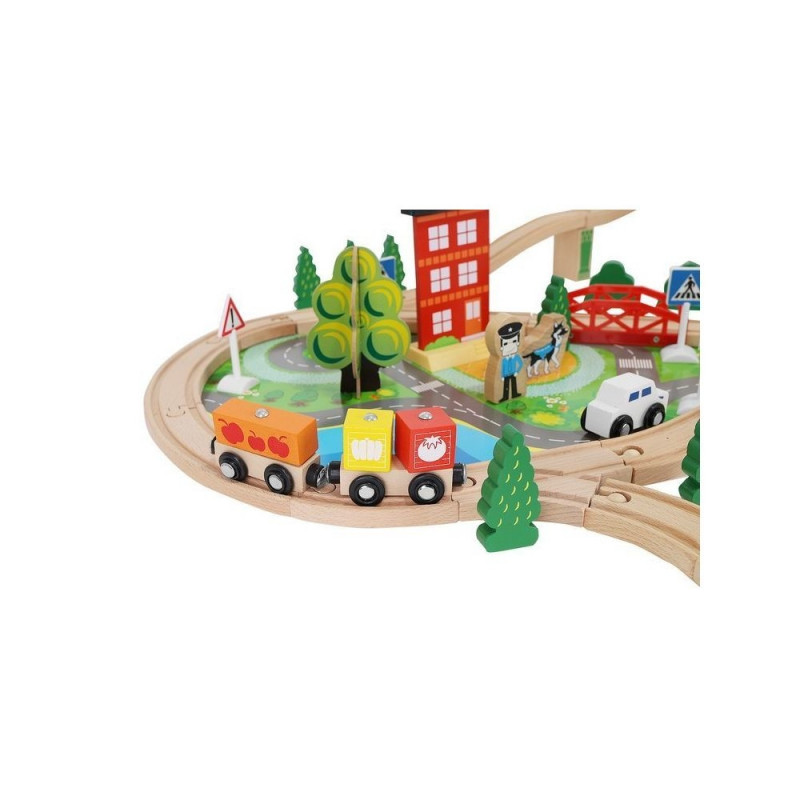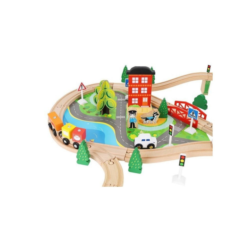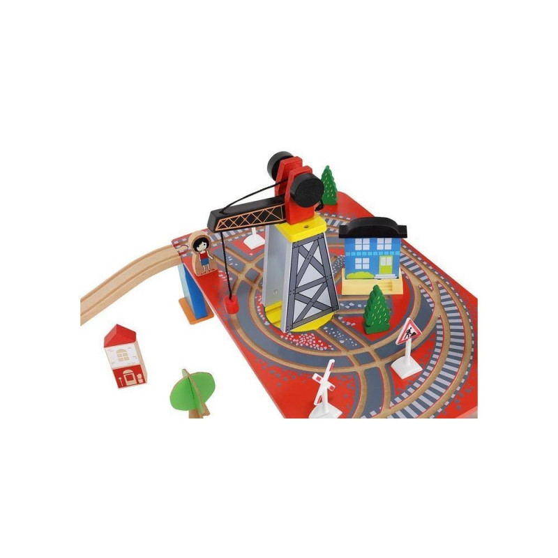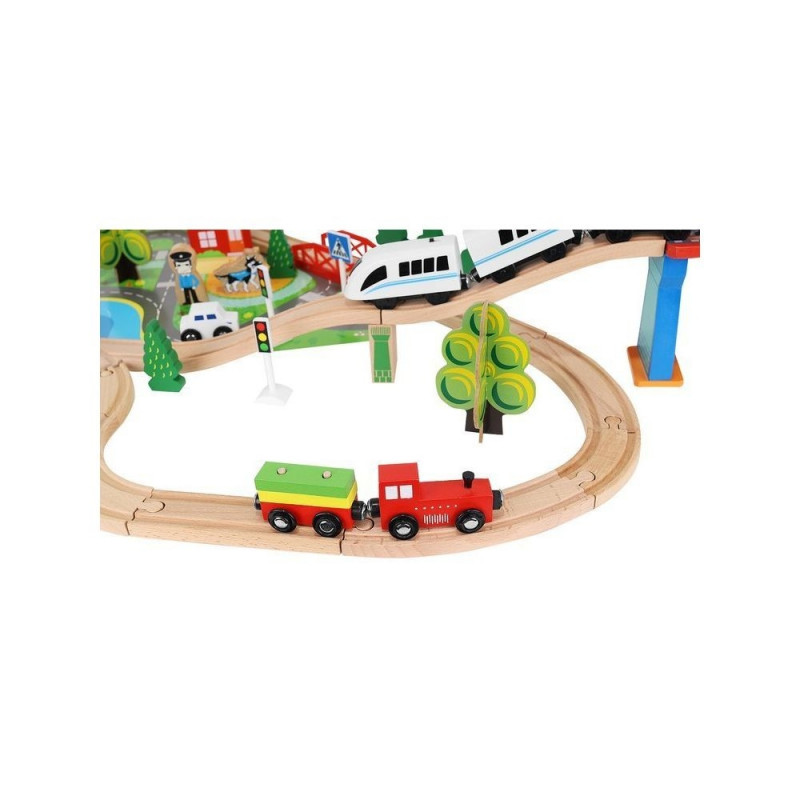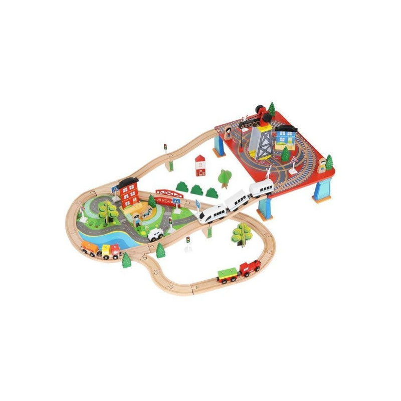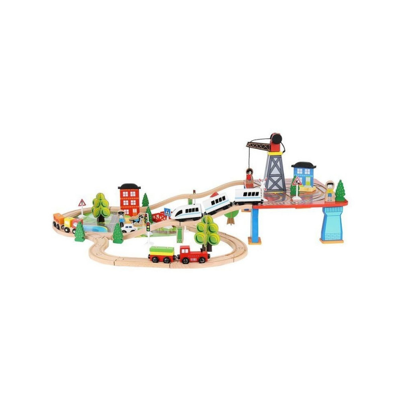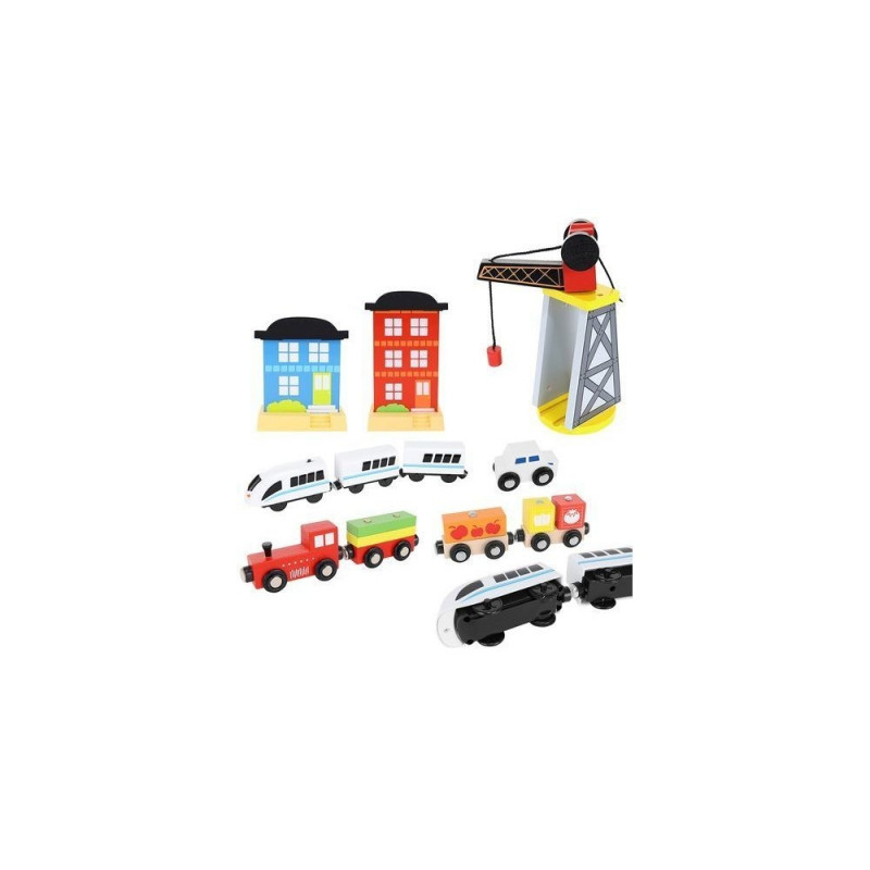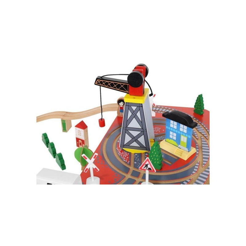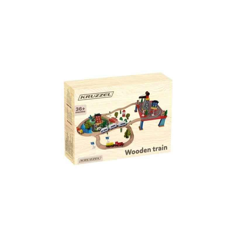 - dominujący materiał: drewno, pozostałe: ABS + PP + żelazo + magnes + poliester + MDF) ? w zestawie 21 elementów toru, 12 choinek, 10 znaków, 6 podpór, 4 drzewa, 3 budynki, 3 ludziki, 1 pies, 1 pociąg osobowy, 1 pociąg towarowy, 1 samochód, 1 dźwig + konstrukcja, 1 podstawa ? port, 1 plansza imitująca drogę dla samochodu
