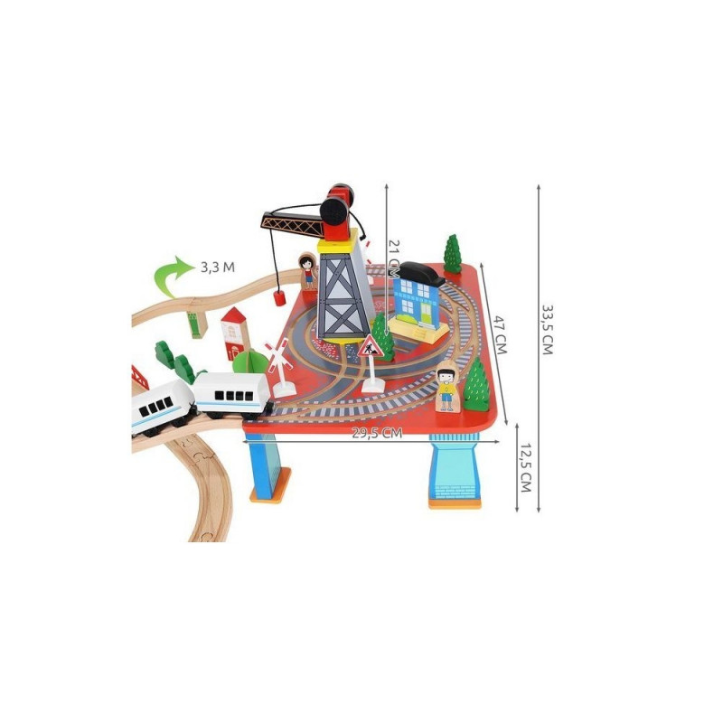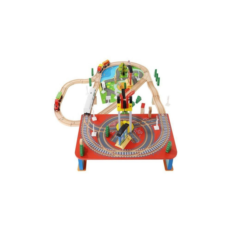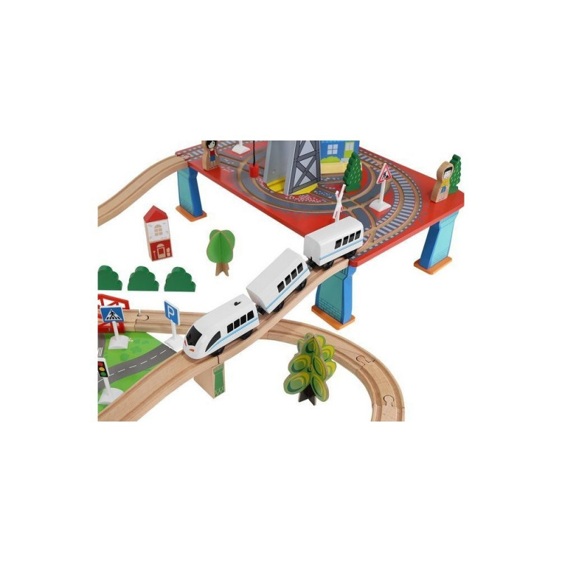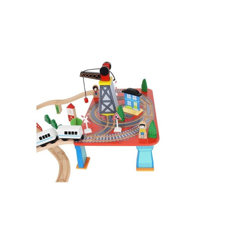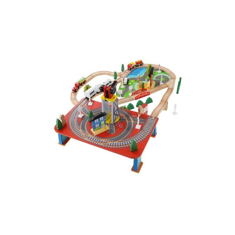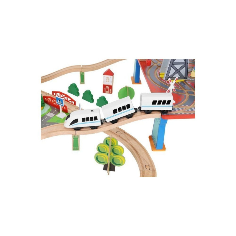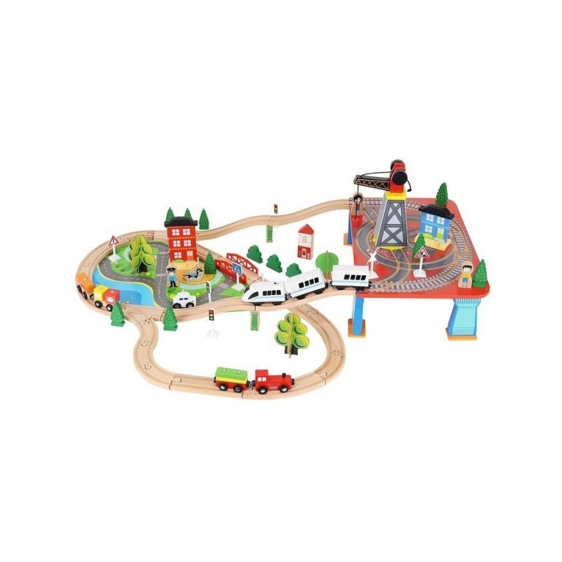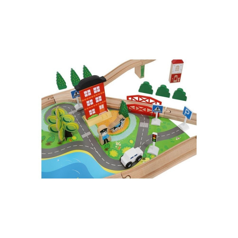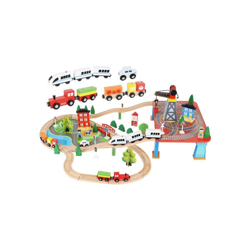 - dominujący materiał: drewno, pozostałe: ABS + PP + żelazo + magnes + poliester + MDF) ? w zestawie 21 elementów toru, 12 choinek, 10 znaków, 6 podpór, 4 drzewa, 3 budynki, 3 ludziki, 1 pies, 1 pociąg osobowy, 1 pociąg towarowy, 1 samochód, 1 dźwig + konstrukcja, 1 podstawa ? port, 1 plansza imitująca drogę dla samochodu