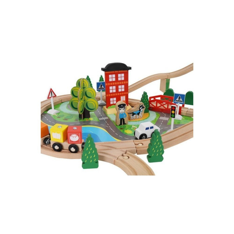 Kolejka z drewna to wspaniały pomysł, aby ćwiczyć wyobraźnię i wspomagać kreatywność dziecka. Nadaje się do zabawy w domu, jak i na świeżym powietrzu. Zestaw składa się z 88 elementów precyzyjnie wykonanych i ładnie wykończonych, które można układać według własnego pomysłu. W komplecie znajduje się m.in tor, pociąg towarowy, pociąg osobowy, samochód, zestaw drzewek i znaków drogowych, 3 ludziki oraz pies policyjny, port przeładunkowy z dźwigiem, a także plansza imitująca drogę dla samochodu.