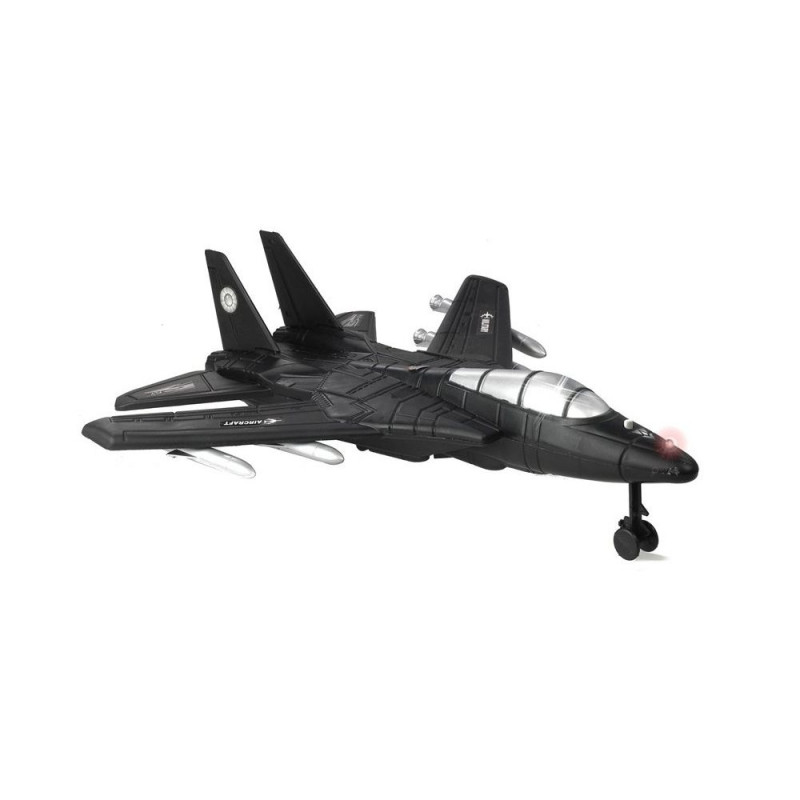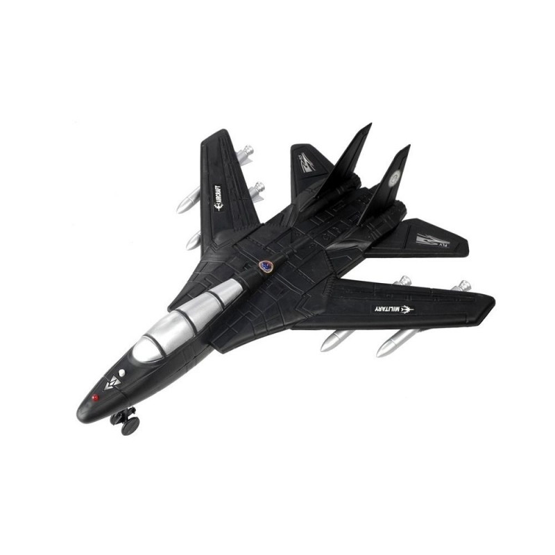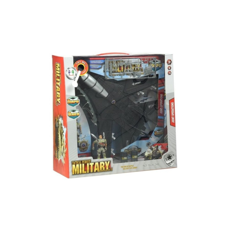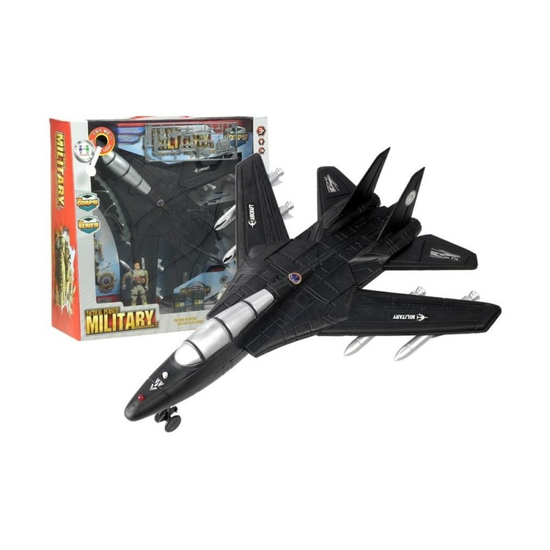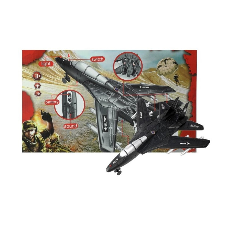 Odrzutowiec wojskowy z efektami specjalnymiOdrzutowiec wojskowy jest rewelacyjną propozycją dla małych chłopców, którzy uwielbiają bawić się w wojenne strategie. Dzięki elementom zestawu dziecko będzie mogło wczuć się zarówno w pilota wojskowego samolotu, jak i spadochroniarza. Komplet zabawek militarnych sprawi, że sceneria zabawy może przybrać wygląd poligonu, na którym walczą odważni żołnierze.W skład zestawu wchodzą:- samolot myśliwiec,- 2 figurki żołnierzy,- 2 butle z gazem,- spadochron,- broń: między innymi karabiny, pistolety i nóż.Prezentowany zestaw wojskowy posiada wiele wyróżniających go spośród pozostałych zabawek zalet ? wszelkie elementy wykonane są z atestowanego materiału wysokiej jakości, jakim jest plastik. Samolot, figurki i pozostałe akcesoria odznaczają się charakterystyczną kolorystyką, co z pewnością spodoba się każdemu małemu żołnierzowi. Figurki wojskowych posiadają ruchome ręce i nogi, dzięki czemu można ustawić je w wybranych przez dziecko pozycjach, a także umieścić w ich dłoniach broń. Największą atrakcją zestawu jest samolot odrzutowy o imponującym rozmiarze 40 cm, który posiada rewelacyjne efekty dźwiękowe i świetlne. Po naciśnięciu guziczka w przedniej części zabawki, dziecko usłyszy dźwięki charakterystyczne dla lotu samolotu oraz odgłosy strzelania, którym będzie towarzyszyć czerwone światełko.Uważamy, że ten zestaw będzie zabawką, która spodoba się każdemu chłopcu. W zestawie znajdzie wszystko, co jest niezbędne do udanej, a przede wszystkim długiej i rozwijającej zabawy. Co ważne, zestaw ten posiada najważniejsze elementy, stanowiące bazę do powiększania kolekcji. Zestaw militarny zapakowany jest w estetyczny karton z witrynką i rączką umieszczoną w górnej części pudełka. Przeznaczony jest dla wszystkich dzieciaków powyżej 3. roku życia. Zabawka posiada certyfikat CE, stanowiący o bezpieczeństwie płynącym z jej użytkowania.Wymiary zabawki:- samolot: 40 cm x 35 cm x 11 cm,- figurka: 10 cm x 5 cm,- spadochron: 19 cm x 8 cm.Wymiary opakowania:- 38 cm x 37 cm x 14 cm.