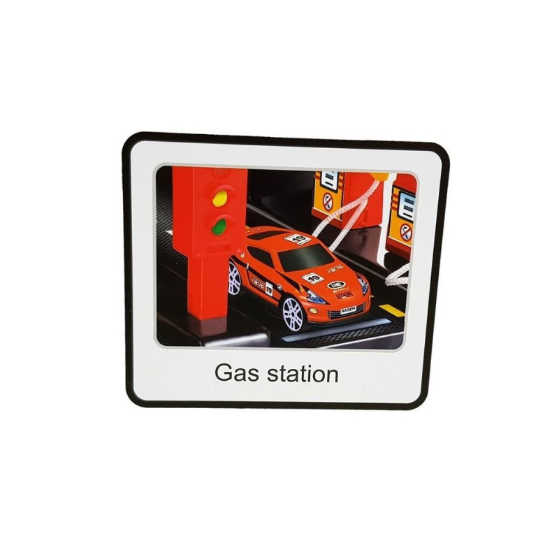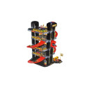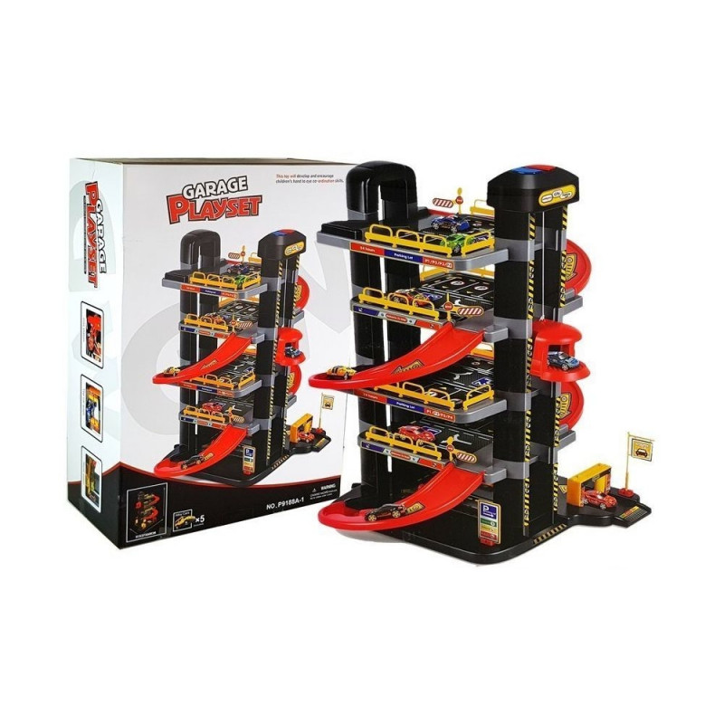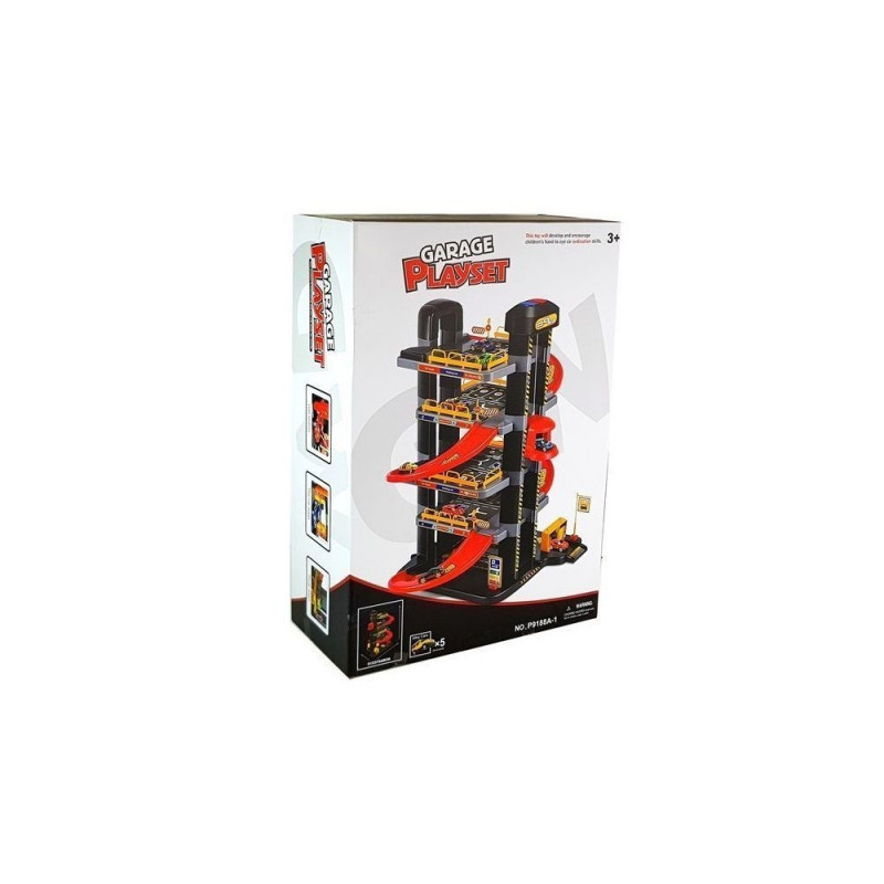 Parking składa się z 5 poziomów. Rozpoczynając od poziomu 2 do 5 mamy parking, gdzie Twój maluch może zaparkować swoje autka. Kolejne poziomy połączone są zjazdami oraz windą. Super zaletą jest to, że na szczycie budowli znajdują się dwa przyciski sterujące windą. Autka mogą jeździć dzięki niej w góry i w dół, a towarzyszą temu światełka, które dodają efektu. Po drodze napotka wiele atrakcji takich jak: serwis, myjnia czy stacja paliw.