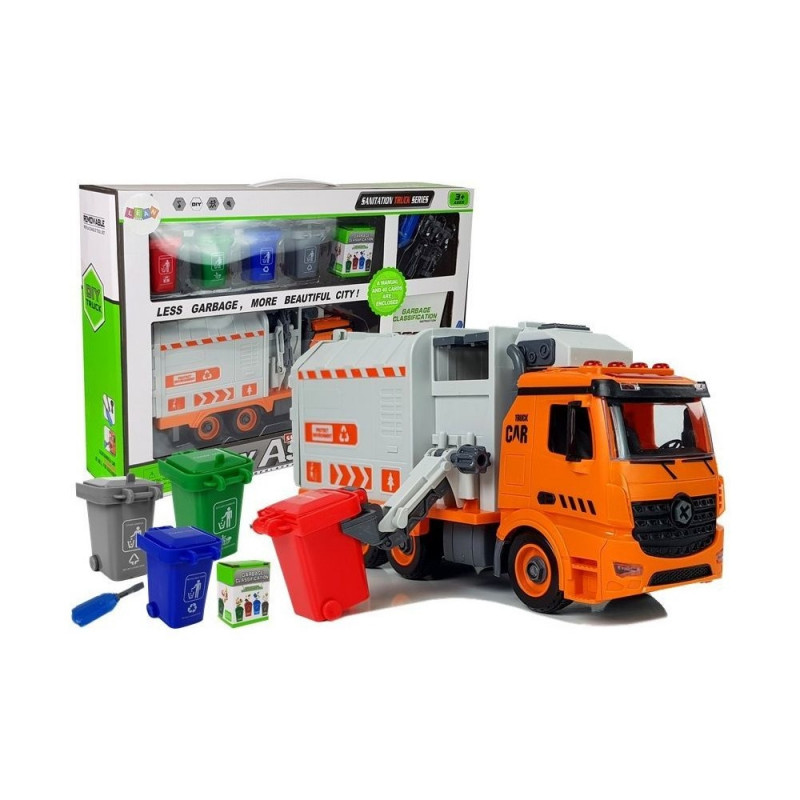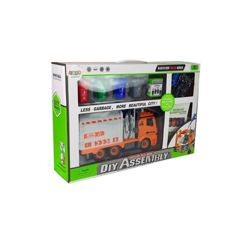 Ta zabawka to może być początek, żeby nauczyć Twojego malucha zasad segregowania śmieci i recyklingu. Dbanie o naturę jest ważne, a poprzez zabawę nie będzie traktować tej czynności jako przymus. Sprawi mu to wręcz frajdę i dużo zabawy. Do zestawu dołączone są karty przedstawiające różne przedmioty (podpisane w języku angielskim -świetna nauka języka obcego), które trzeba wrzucić do odpowiedniego kosza. Ta gra uczy jak prawidłowo segregować śmieci. Autko na górze kabiny posiada 4 przyciski, które uruchamiają dźwięki i efekty świetlne. W zestawie znajdują się 4 kontenery. Tylna rampa otwiera się, dzięki czemu możemy bez problemu wyrzucić śmieci, opróżnićkontener na śmietnisku.