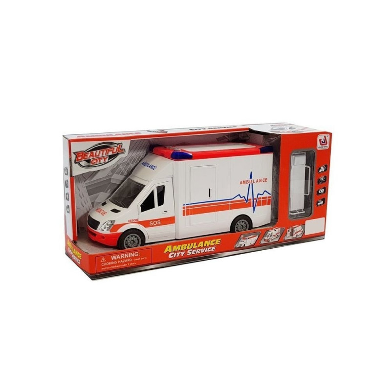 Idealnie odwzorowany ambulans. Auto dopracowane w każdym szczególe, wnętrze wyposażone jest we wszystkie elementy prawdziwego pojazdu takie jak kierownica, deska rozdzielcza, siedzenia. Pojazd posiada dźwięki oraz efekty świetlne, włączane przyciskami umieszczonymi na dachu pojazdu. Auto posiada napęd typu power friction. W pojeździe otwierają się drzwi boczne i tylne oraz posiada zdejmowany dach. Dodatkowo w zestawie znajdują się rozkładane i wyjmowane nosze ratownicze. Autko jest lekkie i ładnie wykonane, zasilane bateriami, które dołączono do zestawu. Pojazd posiada gumowe koła. Rewelacyjna karetka do przewodu pacjentów lub innych zadań podczas akcji ratowniczej.