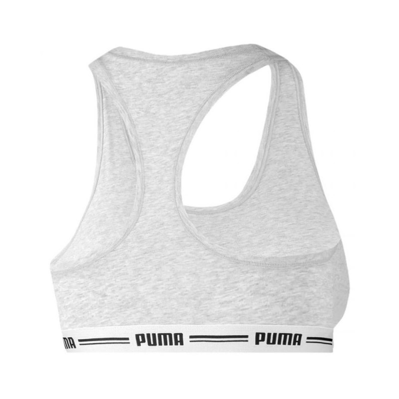 Puma Women's Sports Bra Racer Back Top 1P Hang Gray 907862 03 Properties: The Puma sports bra is perfect for light-intensity workouts. Fitted design with racerback cutouts. Elastic band supporting the bust. Deep neckline at the front. Model in gray.Product has been archived