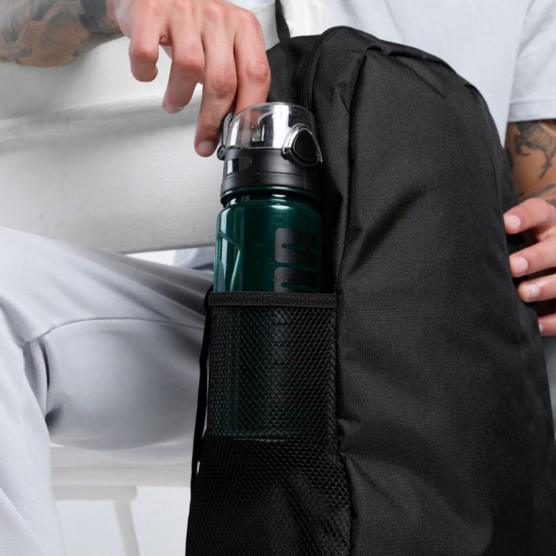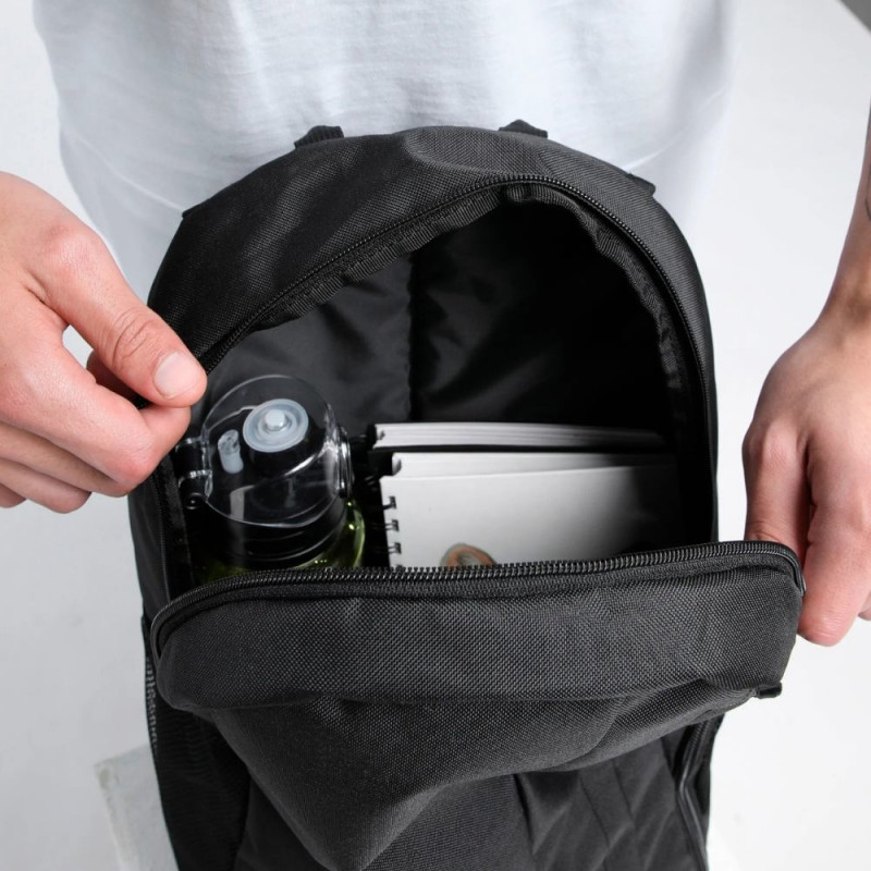 Plecak uniwersalny idealny do szkoły lub wycieczki. Jedna komora główna z dwubiegunowym zamkiem. Przednia kieszeń zapinana na zamek. Parciany uchwyt. Wyściełane, regulowane paski na ramiona. Wsuwana kieszonka z siateczki wykończonej elastyczną lamówką. Druga, zapinana kieszeń o siateczkowej strukturze z boku przeznaczona na obuwie. Przednia kieszeń na zamek. Odblaskowy detal na jednej szelce.