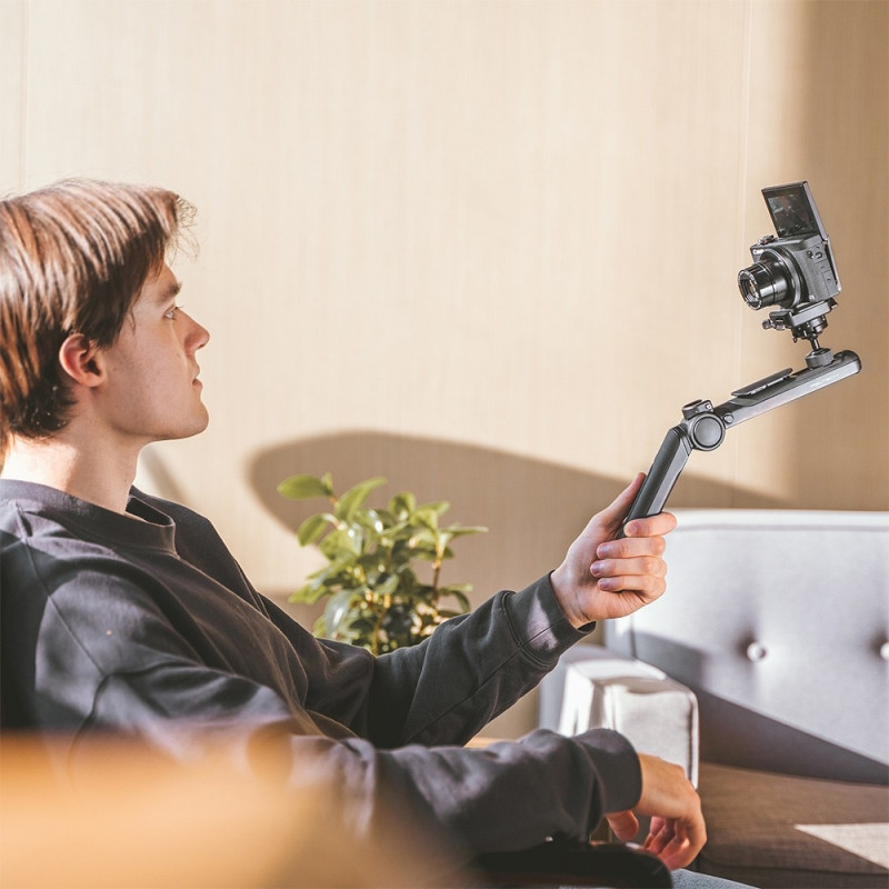 Instant and flexible adjustments between different modes and angles result in efficient shots. The built in Mini phone holder has an Arca Swiss mount, cold shoe mount and 1/4 screw hole for wide compatibility.