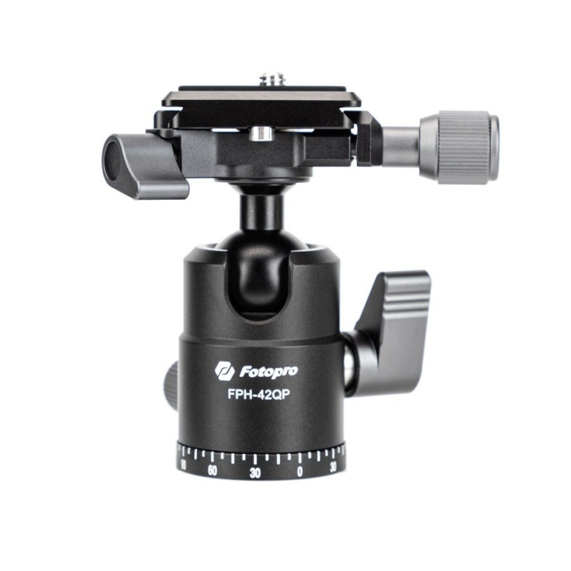 The tripod comes with the Arca type FPH 42QP ball head that can carry cameras weighing up to 12 kilograms with its quick release plate. The tripod head has two separate buttons, one that controls the movement of the ball, which can be positioned at a 90 degree angle, and a second button that controls the 360 degree pan. The ball head is equipped with a spirit level so you always have a straight horizon.