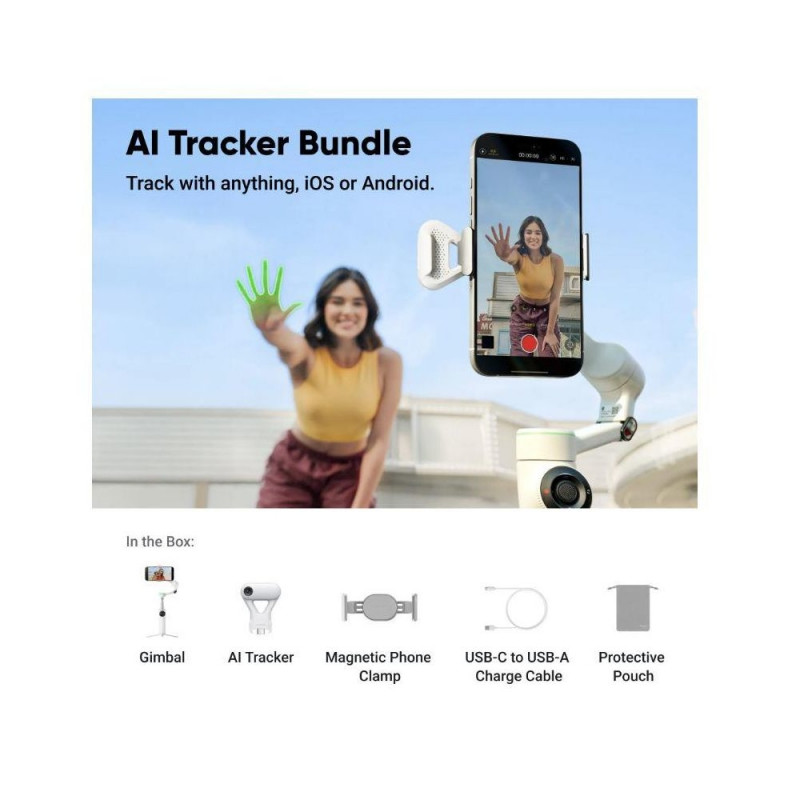 • No restrictions on phone models or apps. Includes 1x Insta360 Flow 2 Pro, 1x AI Tracker, 1x Magnetic Phone Clamp, 1x USB-C to USB-A Charge Cable and 1x Protective Pouch.