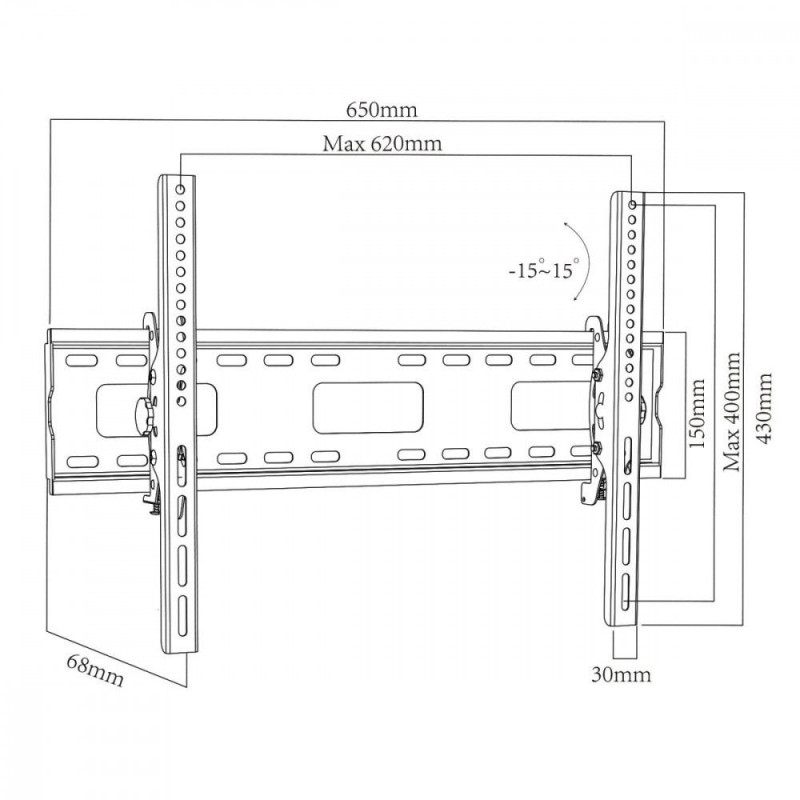 Other features | - Manufacturer: Maclean - Model: MC-421 - Maximum load: 80 kg - Minimum/Maximum horizontal spacing: 100/600 mm - Minimum/Maximum vertical spacing: 200/400 mm - Adjustable degree of tilt: +15°~-15° - Powder coating - Color: black - Distance from wall: 68 |
