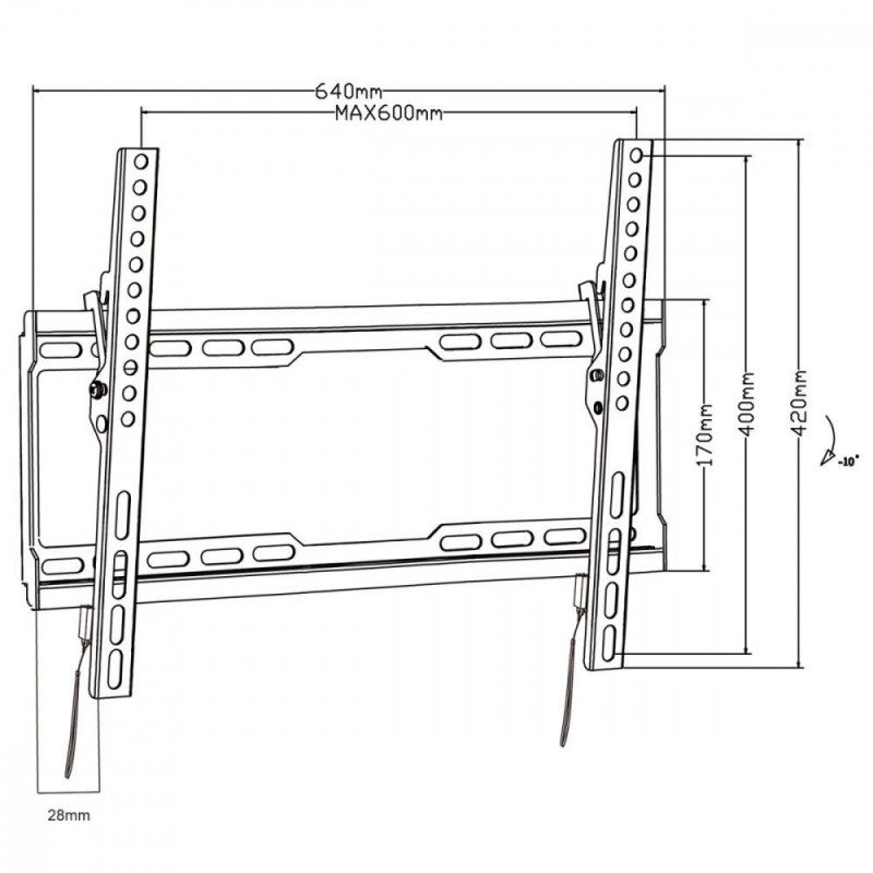 Other features | - Manufacturer: Maclean - Model: MC-413 - Maximum load: 45 kg - Minimum/Maximum horizontal spacing: 100/600 mm - Minimum/Maximum vertical spacing: 200/400 mm - Adjustable degree of tilt: +0°~-10° - Powder coating - Color: black - Distance from wall: 28 |