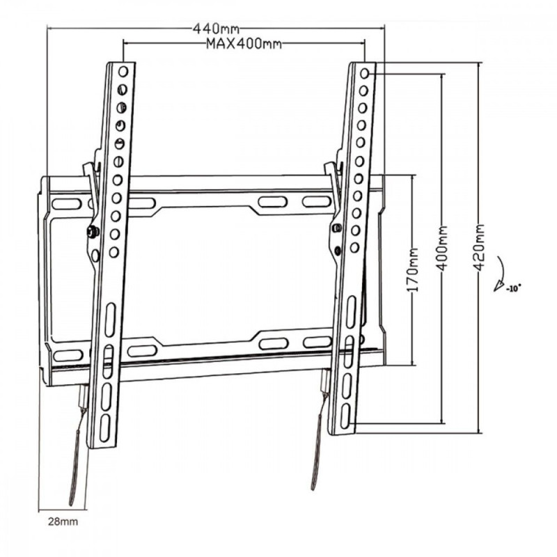 Other features | - Manufacturer: Maclean - Model: MC-412 - Maximum load: 45 kg - Minimum/Maximum horizontal spacing: 100/400 mm - Minimum/Maximum vertical spacing: 200/400 mm - Adjustable degree of tilt: +0°~-10° - Powder coating - Color: black - Distance from wall: 28 |