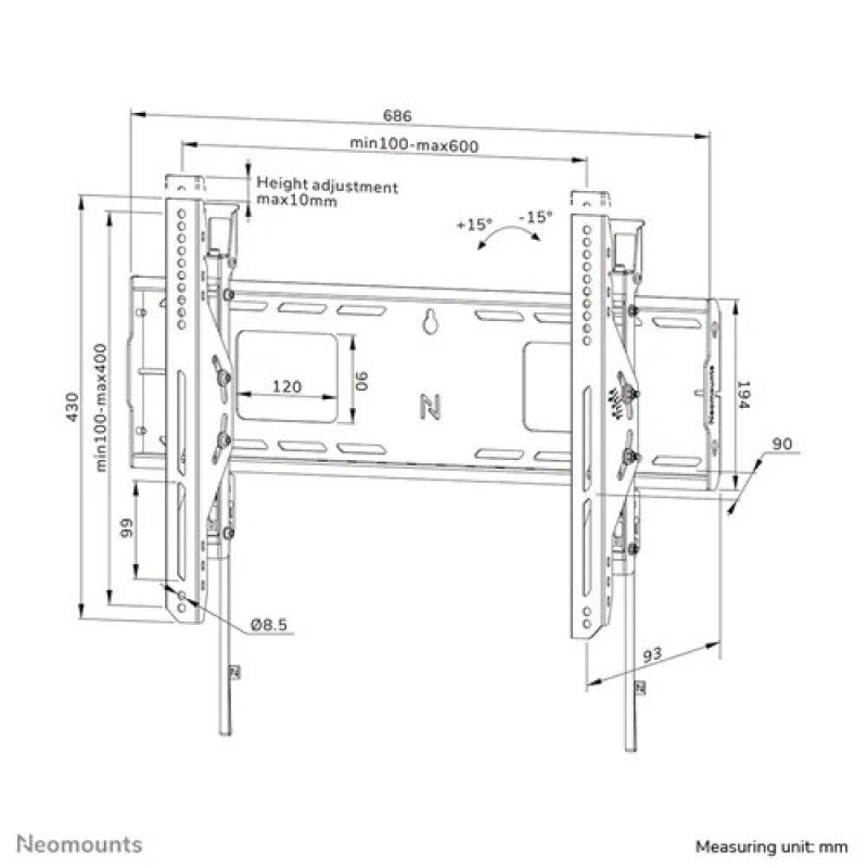 Neomounts WL35-750BL16 LEVEL is the ultimate tilt solution for securely mounting an interactive or heavy display up to 86 inches with a maximum load capacity of 125 kg. Tool-free tilt adjustment (+15°/-15°) allows for optimal viewing angles. This durable wall mount features a solid, contoured wall plate and is designed for stability and precision, ensuring a secure screen mount even on uneven surfaces. The mount has individual adjustable brackets (10 mm) for securely adjusting the height of the display or leveling it.