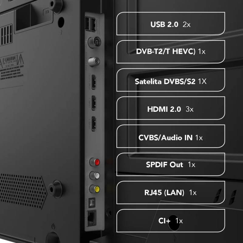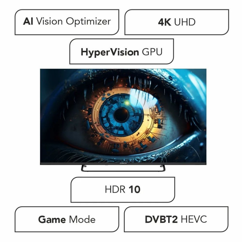 AI Vision Optimizer is an image scaling technology supported by artificial intelligence. The system features an optimized SMART platform based on VIDAA. It includes dual tuners for SAT and DVB-T2. The design is frameless and slim, powered by a powerful quad-core processor. It runs the latest HyperVision GPU software supporting advanced GPU capabilities. The TV offers a Game Mode for low latency performance and uses an IPS (In-Plane Switching) LED panel with 4K UHD resolution. It supports HDR 10 and Dolby Digital Plus 5.1 surround sound. HDMI ports support CEC and ARC for enhanced audio connectivity. Essential apps for movies, TV shows, and entertainment come pre-installed. Additionally, the device includes a Hotel Mode for professional or commercial use.