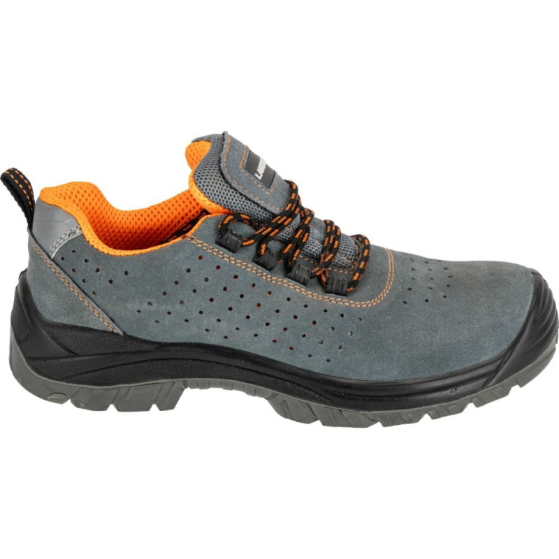 - MATERIAŁ: Wierzch: skóra zamszowa, zewnętrzna konstrukcja zwiększa cyrkulację powietrza wewnątrz obuwia. Podszewka: dzianina siatkowa. Wyściółka: wymienna. Podeszwa: poliuretan dwugęstościowy o właściwościach antypoślizgowych (podłoże stalowe i ceramiczne), odporna na olej napędowy, głęboki bieżnik zwiększa przyczepność do podłoża