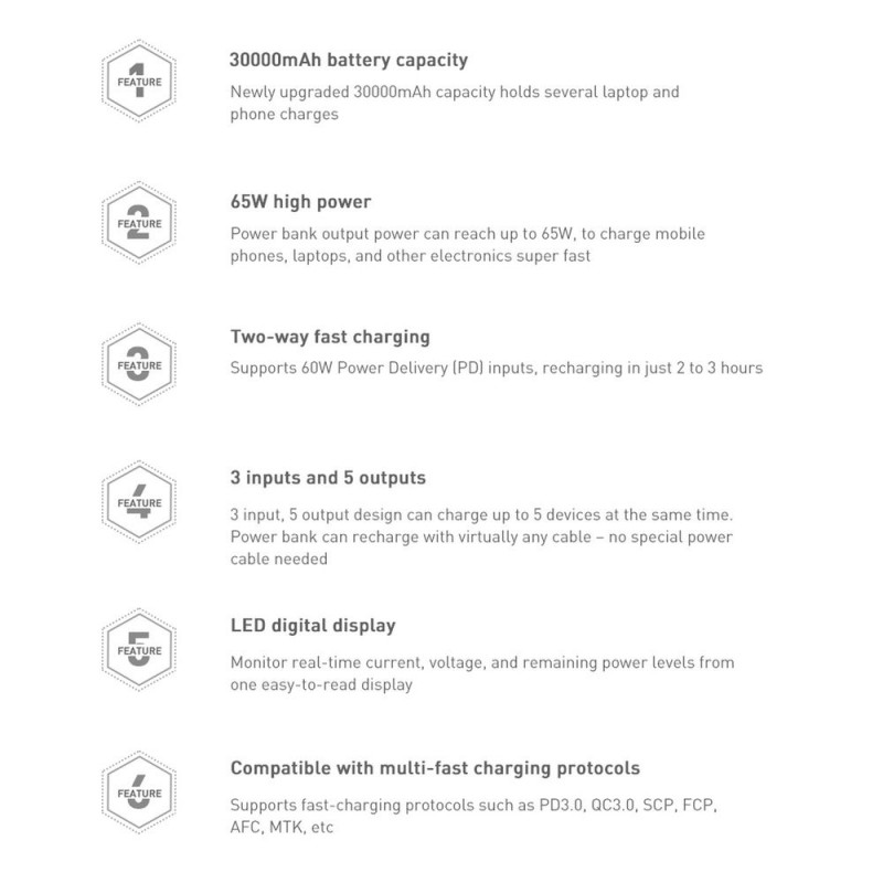 **Hiiglaslik mahtuvus**Lausa 30 000 mAh energiat on piisav, et toetada paljusid seadmeid, mis vajavad laadimist. Näiteks iPhone 8 saab täielikult laadida umbes 12 korda, iPhone XR umbes 8 korda ja Xiaomi Mix 3 umbes 6 korda. Sellise mahuka energiavaruga ei pea te muretsema, et jääte mitmepäevasel muusikafestivalil või matkaseikluses telefonita.