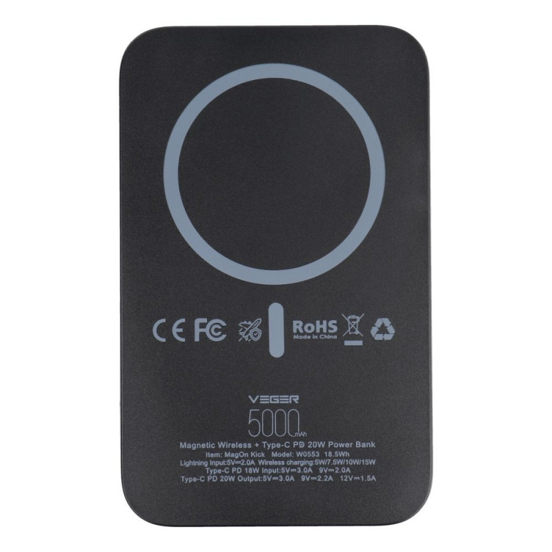 VEGER powerbank 5000 mAh with wireless charging compatible with MagSafe PD QC3.0 2A 20W MagOn Kick (